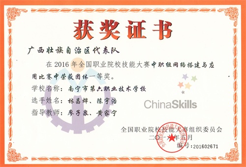 南宁六职校在2016年全国职业院校技能大赛中职组网络搭建与应用比赛中获团体一等奖