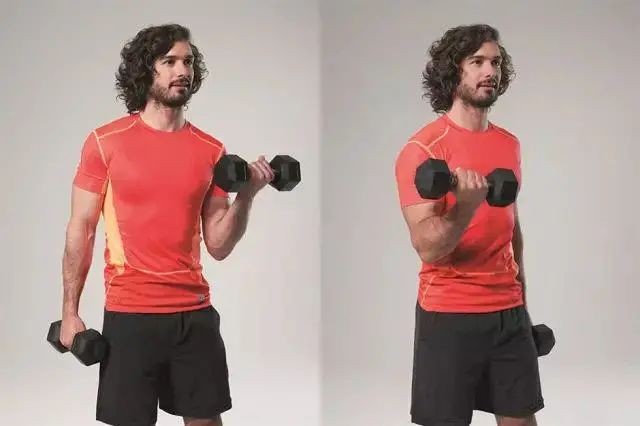 练习方法:两腿分开站立与肩同宽,身体呈直立姿势,两手各握一哑铃于体侧,然后做屈肘弯举哑铃动作,当弯举哑铃至胸前时停住,大小臂呈30度夹角,大臂与地面接近平行,然后再放下哑铃至体侧。每组练习20~?30次,组间休息时间2~3分钟,共练习6组。练习要求:伸屈肘的速度要快一点,放下的速度稍慢一点。