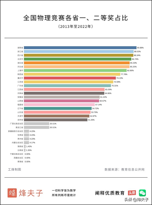 在省级层面,全国物理竞赛中一等奖和二等奖的占比,相比总量更能说明各省份之间水平的差异。