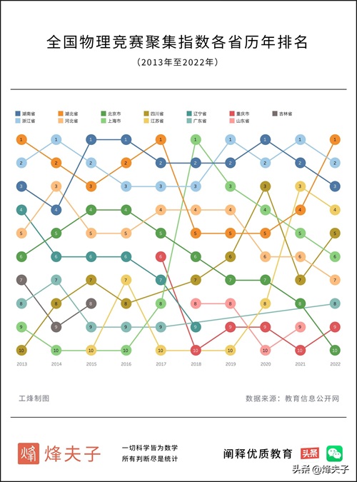全国物理竞赛聚集指数各省历年排名(2013年至2022年)