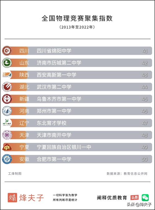 再单看学校,将全国指数位居前50的中学列出。在下列图中,以橙色进度条代表学校全国物理竞赛聚集指数时间窗口内总数,数值最大者为满格。