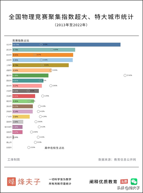 按国家统计局“七普分县数据”,对比7个超大城市、14个特大城市物理竞赛情况,如下图所示。其中,高中在校生占比为2020年该市高中在校生在所有超大、特大城市中的占比,竞赛指数占比为该市高中竞赛指数在所有超大、特大城市中占比。