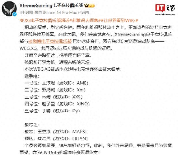 IT之家 6 月 6 日消息,XtremeGaming 电子竞技俱乐部(简称 XG)今日宣布与微博电子竞技俱乐部达成合作,双方将以崭新的联合战队名 —— WBG.XG 征战 2024 沙特电竞世界杯。