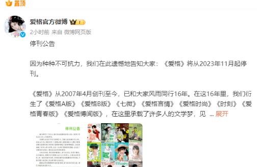 近日,爱格官方微博发布了停刊公告,宣布《爱格》杂志将从2023年11月起停刊。这一消息引起了广泛关注,许多网友对此表示了不舍和遗憾。