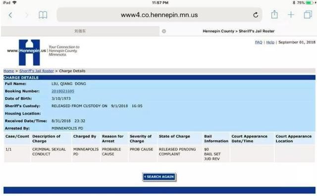 根据该市所在的亨内平县 (Hennepin County) 治安官网站记录,Qiang Dong Liu 于当地时间8月31日晚间11:32分在入狱。疑犯出生日期为1973年3月10日,与京东创始人兼 CEO 刘强东本人的身份证相符。