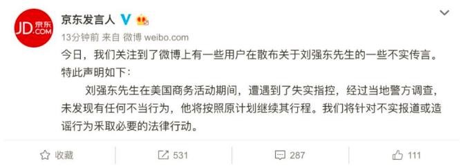 很快,京东官方微博发布声明说, 刘强东先生在美国商务活动期间,遭遇到了失实指控,经过当地警方调查,未发现有任何不当行为,他将按照原计划继续其行程。我们将针对不实报道或造谣行为釆取必要的法律行动。