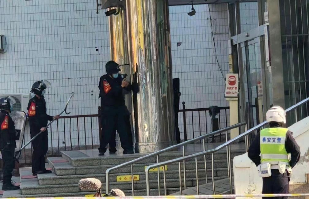 事发于今日午间12时许,中国银行泰山支行发生抢劫案。现场画面可见,武警、特警持枪在银行外包围现场,与嫌犯进行对峙,交警也拉起封锁线,撤离附近民众。