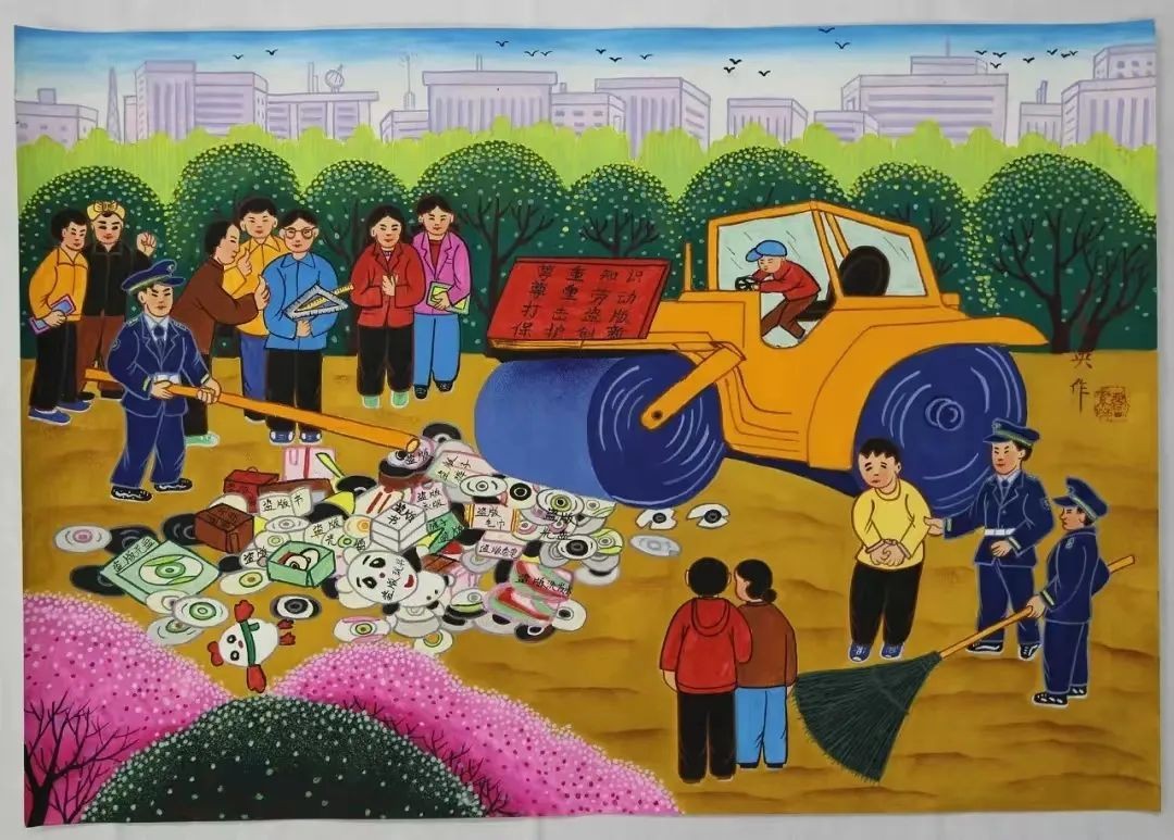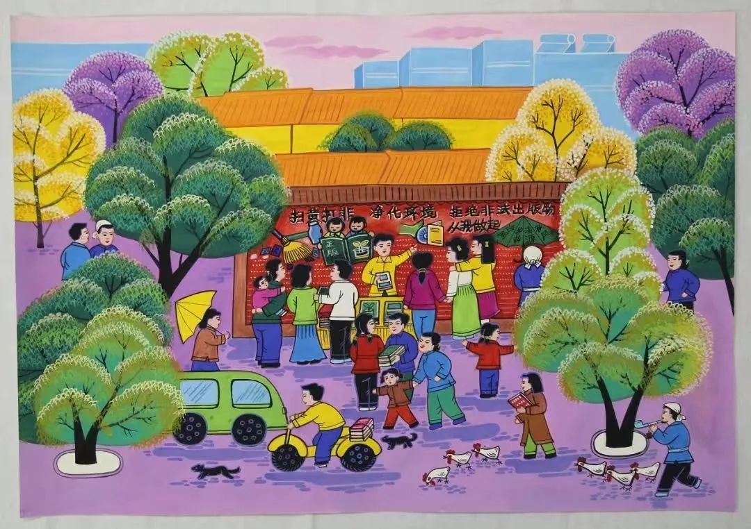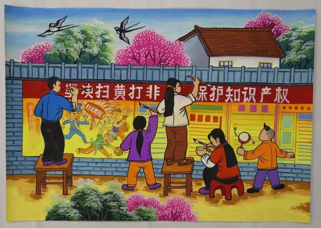 农民画源于民间,其中西安市鄠邑区是闻名中外的农民画之乡。近年来,西安市鄠邑区积极保护、开发、利用农民画这一文化品牌,助力“扫黄打非”工作开展。2018年,鄠邑区“扫黄打非”办组织农民画家创作“扫黄打非”主题农民画,在庞光镇姚家河村建设主题文化长廊,起到了良好的宣传效果。2019年,庞光镇被全国“扫黄打非”工作小组办公室评为第二批全国“扫黄打非”进基层示范点。