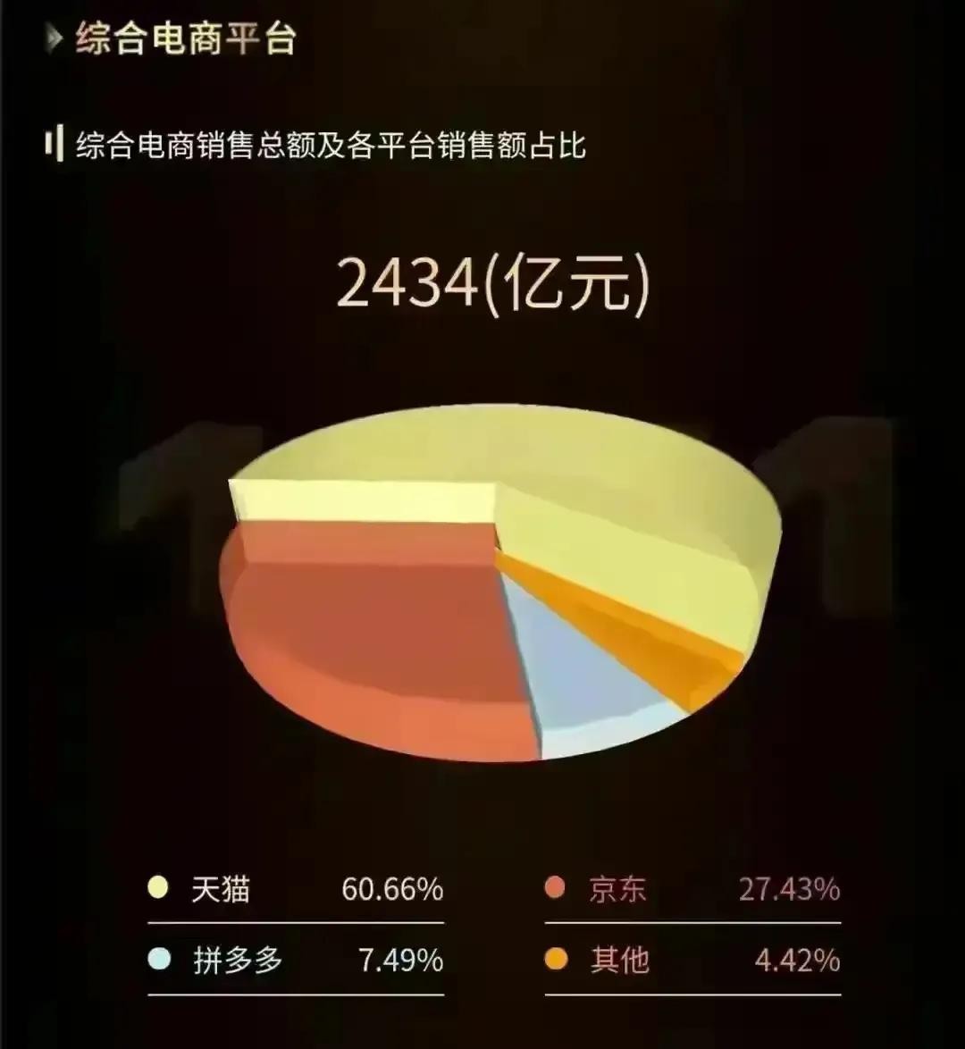 从各电商平台成交额看,天猫占60%以上份额,京东以27%左右排第二,拼多多排在第三(个人感觉这个数据有误,抖音的数据并没有显示出来,按照公开信息,抖音应该和拼多多排名差不多)。
