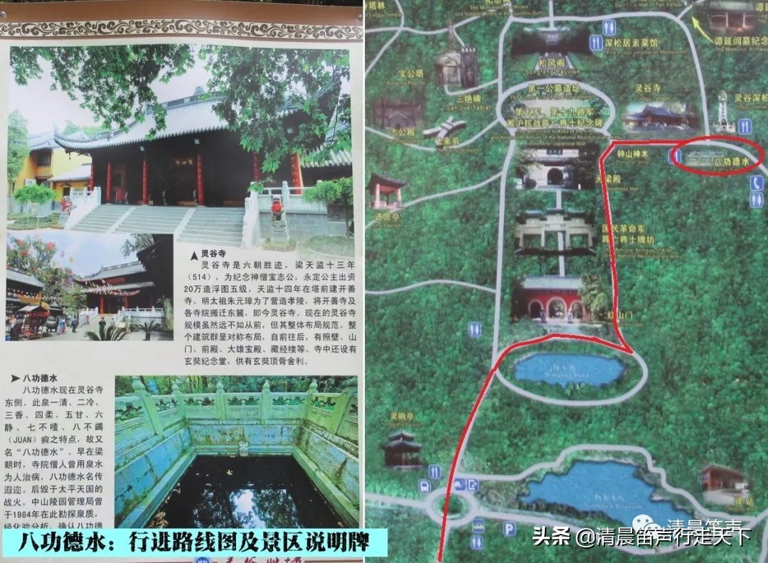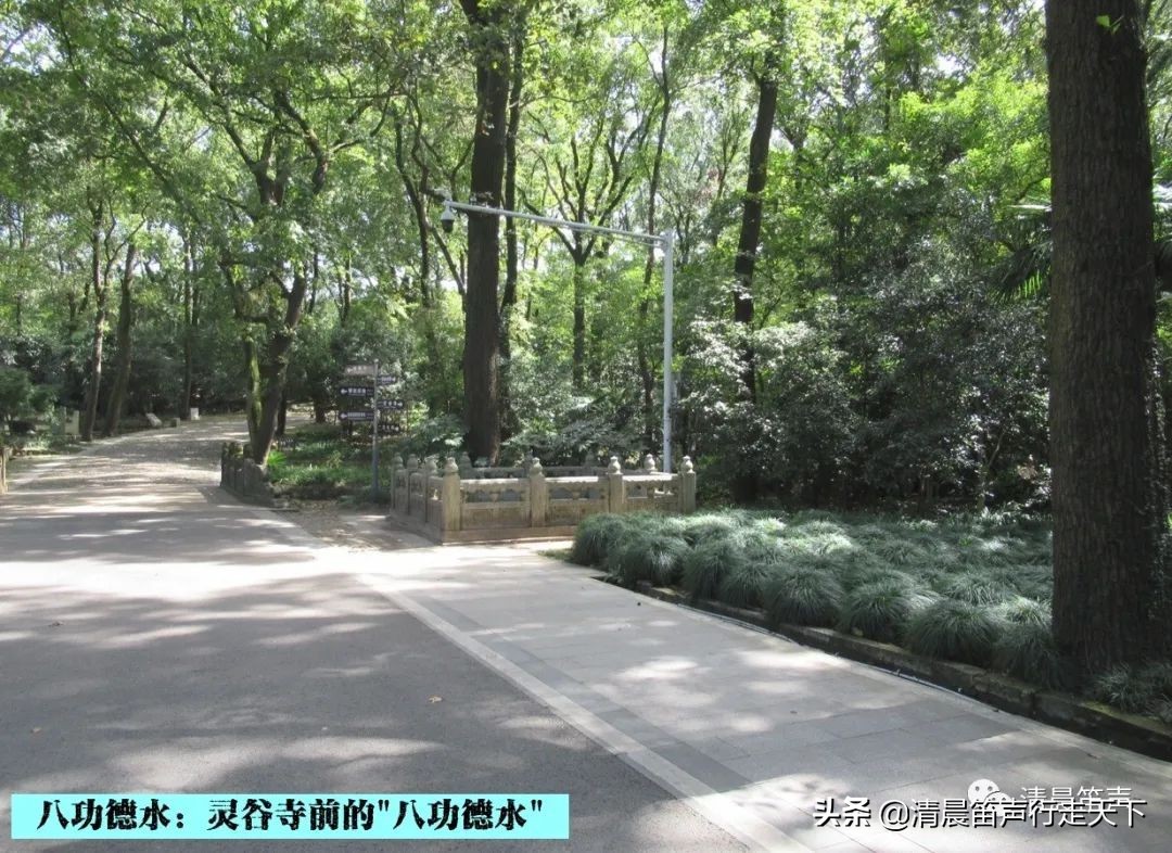 “钟阜晴云、浮屠秋月、古殿钟声、苍池松影、银杏栖霞、清泉咽竹、空阶应掌、曲水流觞”,此乃“灵谷八景”,其中的“清泉咽竹”即指“八功德水”。
