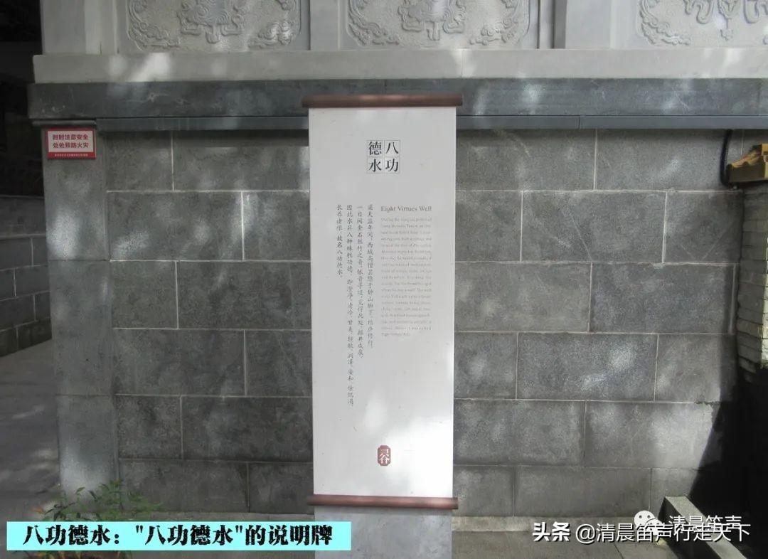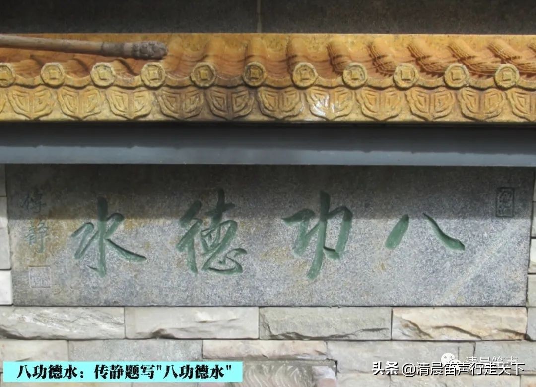 在水池上方,墙壁上镶嵌有一块石刻,上面题写有“八功德水”四个大字,为灵谷寺传静法师所书。
