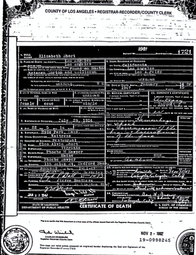 伊莉莎白・萧特(Elizabeth Short)的死亡证明书