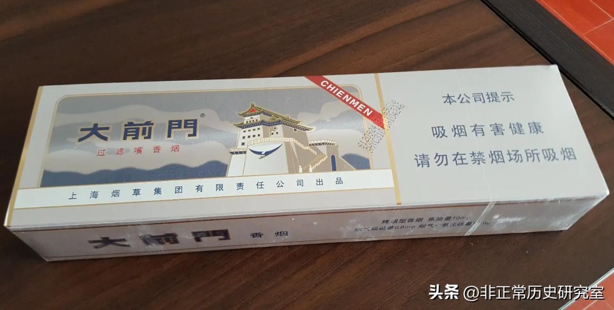如果说大家投票选出一款历史悠久且非常好抽的卷烟的话,大前门牌香烟可以说是TOP3之一,这款香烟是我国最早的“中为洋用”的烟标之一,从1916年诞生以来,至今已经有一百多年的历史了,是英美烟草公司的当家产品,以一句“大人物吸大前门,落落大方”广告词一度占据英美烟草公司全部产烟量的60%,可以说是一款家喻户晓的品牌。