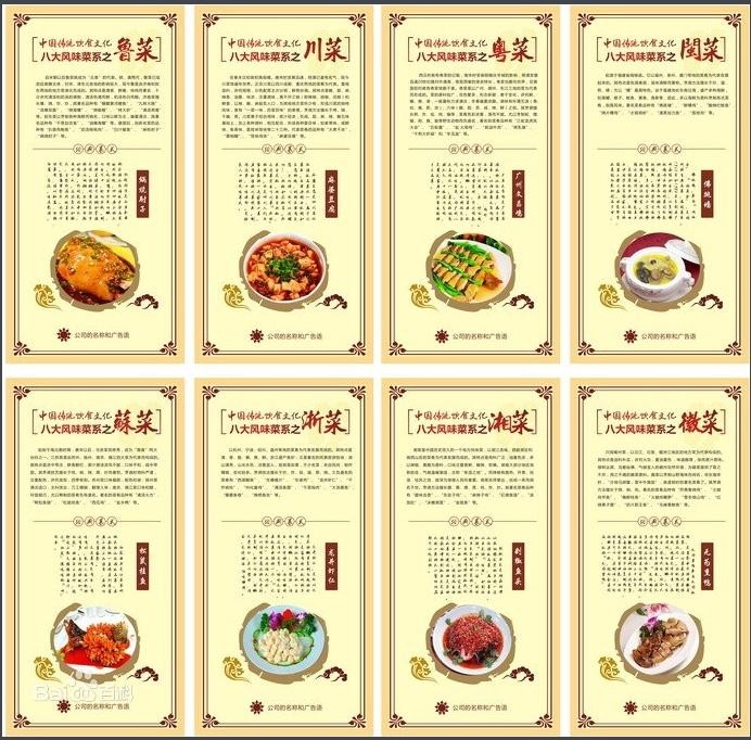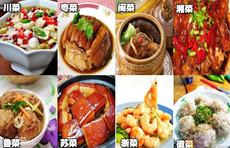 并为部分群众喜爱的地方风味著名流派称作菜系。其中,鲁菜、川菜、粤菜、闽菜、淮扬菜、浙菜、湘菜、徽菜享称为“八大菜系”。