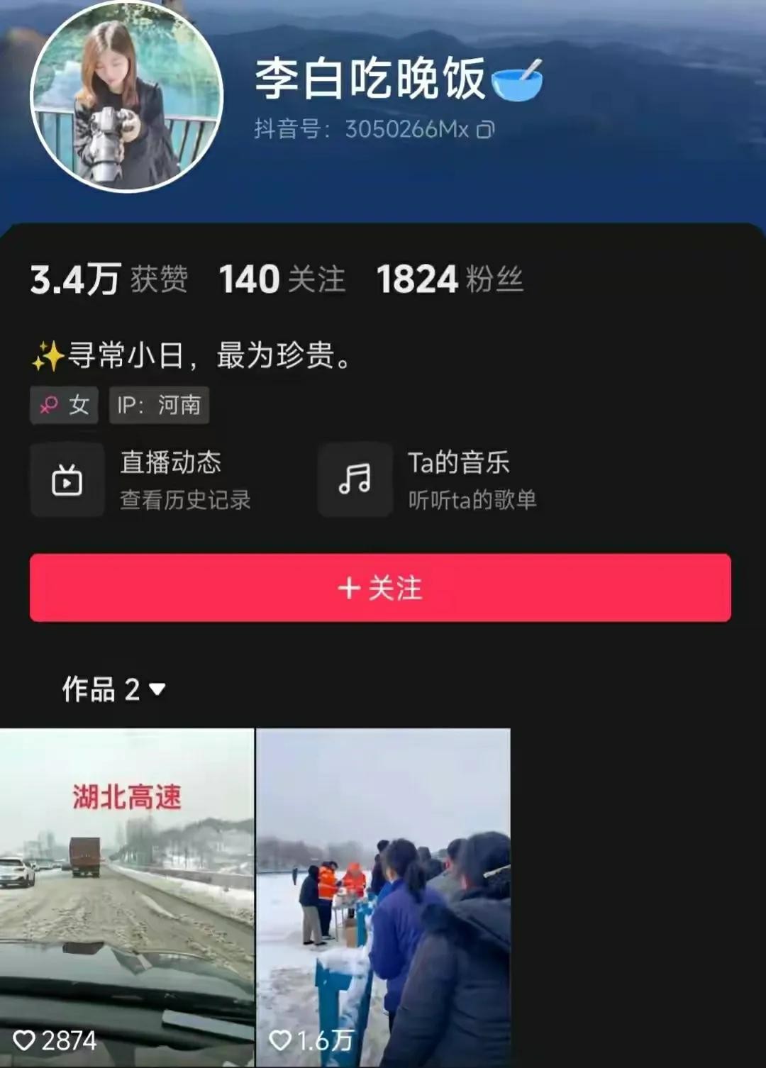 有网友扒出了,女子的个人资料,她在短视频有接近两千粉丝,其中两条作品都是湖北高速有关的内容,其中一条视频就是卖方便面的场景。