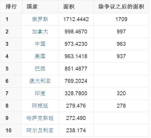 面积前10的国家有俄罗斯、加拿大、中国、美国、巴西、澳大利亚、印度、阿根廷、哈萨克斯坦、阿尔及利亚。
