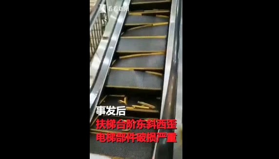 事故发生后,电梯台阶全部东倒西歪,支离破碎,电梯部件破损严重。经查,此次事故是电梯自身故障所致,目前,电梯正在维修。
