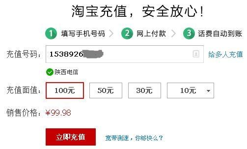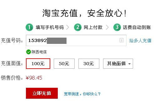 我从来都是在网上充手机话费,每次充100元,基本上不是在淘宝天猫充值平台就是在支付宝生活好帮手里面充,其实都一样,他们是一家子。