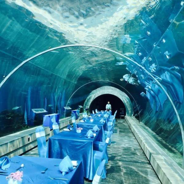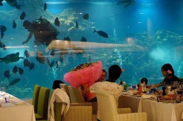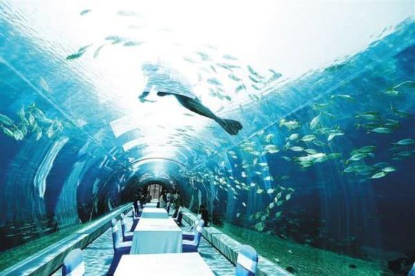 这吸引了不少的小朋友,除此之外餐厅内还有一个餐厅U型通道,这里阳光,再加上许多的海洋生物,使得这个U型通道变得十分的浪漫,也很适合约会,甚至不少人还在这里举行海底婚礼。