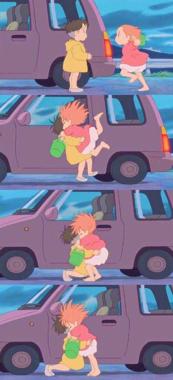 在波妞和宗介去找宗介妈妈的那一段,要经过一个隧道,波妞很害怕,宗介就安慰波妞,让她永远别放开他的手。别放开手,这件事说起来容易,但是往往又是先说的那个人放开了对方的手,但小宗介在看到波妞变成鱼的那一刻,也没有害怕,没有说放开她,这就足够了。