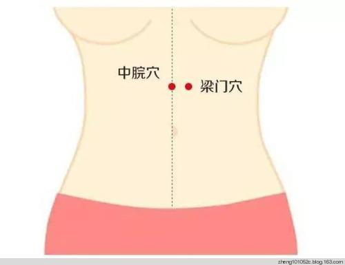 梁门穴,位于肚脐以上,肚脐和胸骨下端中点的水平线上,向左右各旁开三指宽的位置。