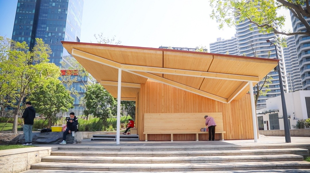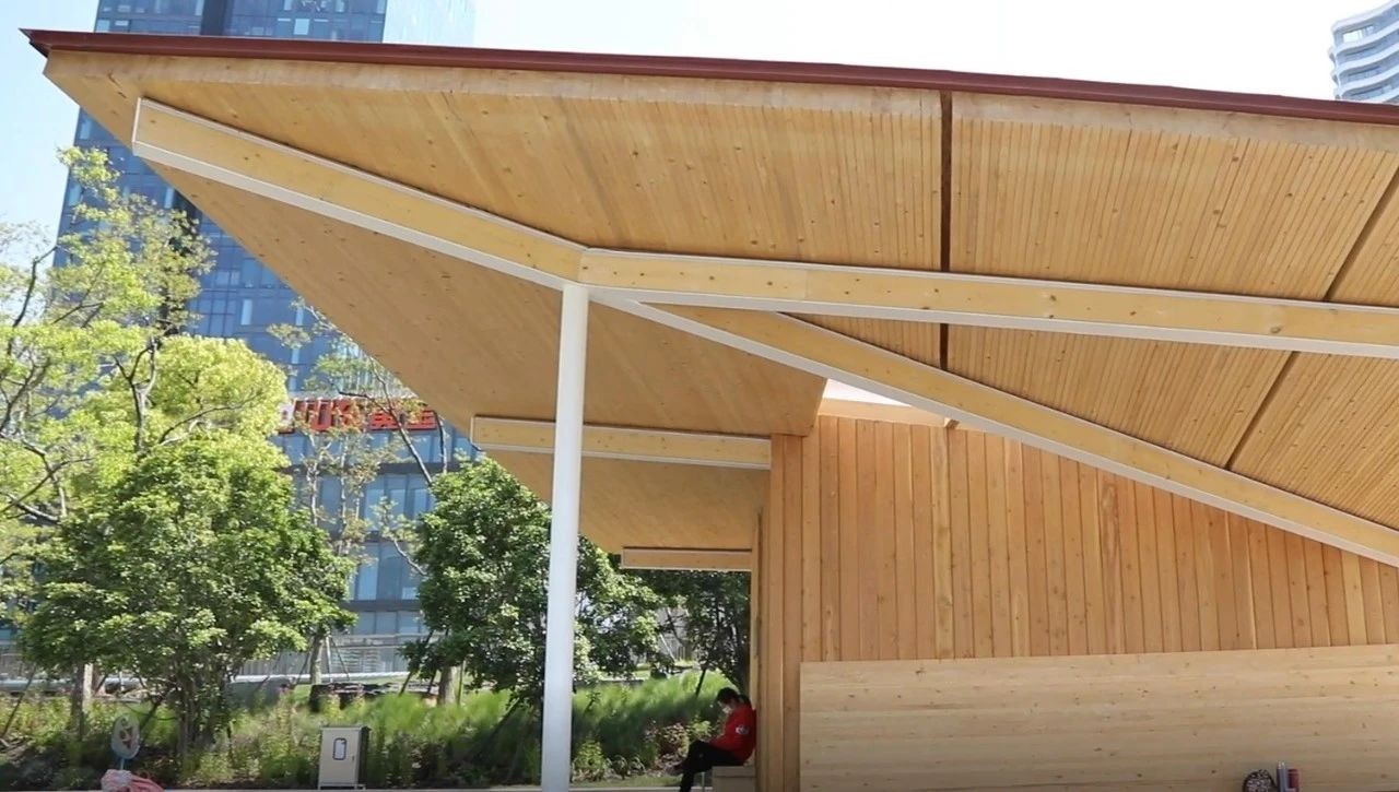 一座木亭子,可望江景可休憩……位于新华绿地和船厂绿地的3座望江亭现已建成并对社会开放。望江亭整体为木结构,外观轻巧简约、美观实用,建筑面积约85平方米,设置有观景座椅、公共卫生间、自动售卖机等设施。