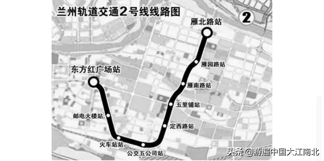 兰州轨道交通2号线(即兰州地铁2号线)一期工程起自东方红广场站,终至雁北路站,长约9.4公里,共设9座车站,分别为:雁北路站、雁园路站、雁南路站、五里铺站、定西路站、公交五公司站、火车站站、邮电大楼站、东方红广场站。该线路远期将会延伸至七里河区、安宁区、西固区。