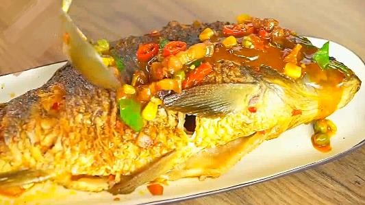 浇汁:然后把鱼捞出,用少许水淀粉将锅中的配料勾芡收汁,把汁淋在鱼身上,美味出锅啦!