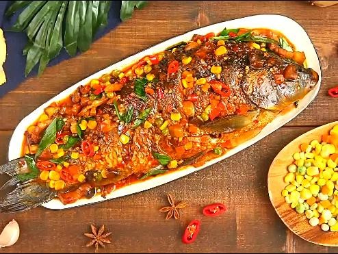 炖煮:水开后将煎好的鱼放入,加盐,糖2勺,醋2勺,青红辣椒粒,香菇粒,玉米粒,小火炖煮10分钟,翻面后再煮10分钟。记得哦,小火慢煮才入味。