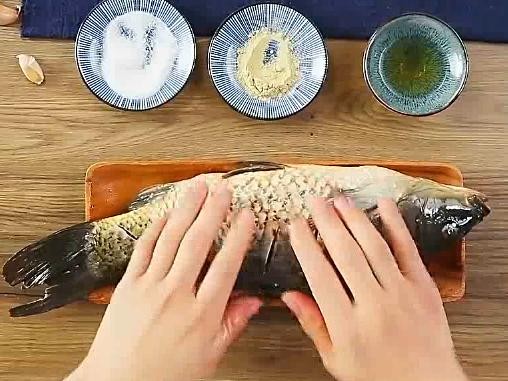 腌制:在鱼身上洒上盐、胡椒粉,料酒,涂抹均匀,给鱼做按摩,腌制15分钟。怪不得平时做鱼不好吃,不入味,就是少了这一步,给鱼按摩腌制。