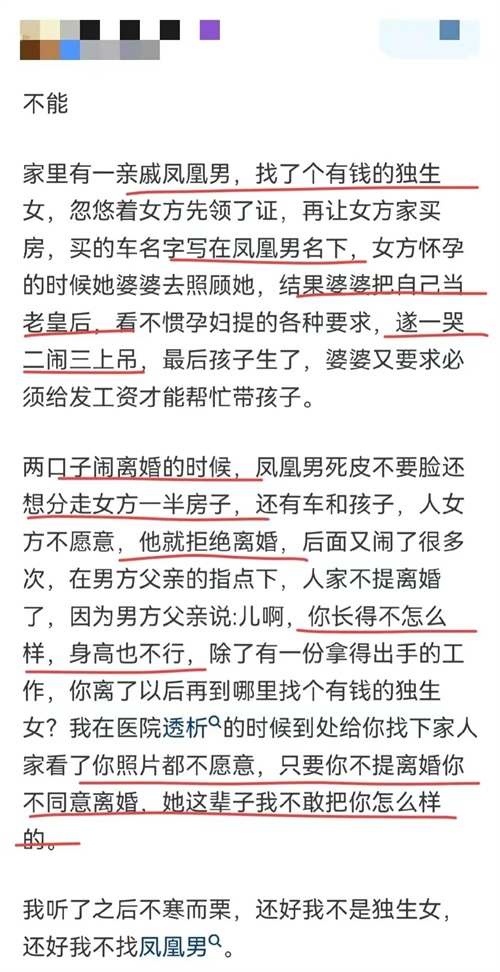 总之,"凤凰男"并非绝对不能嫁,关键在于如何看待和应对婚姻中的风险与挑战。对于"凤凰男"来说,要积极面对自身的不足,不断提升自己的能力和品质,以获得更多的尊重和认可。对于女性来说,要理性看待婚姻,勇敢追求真爱,同时也要有足够的心理准备去面对可能出现的困难和矛盾。只有双方共同努力,才能化解社会阶层差异带来的矛盾,实现真正意义上的婚姻幸福。而对于社会来说,应该关注"凤凰男"这一群体的成长与发展,为他们创造更好的发展环境,促进社会阶层流动,减少婚姻选择上的纠结。