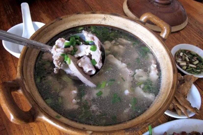 八刀汤是一道色香味俱全的汉族名点,属于客家菜系。广东紫金县的“八刀汤”,算得上是的客家人对猪的完美演绎。“八刀汤”是用黑麦草、番薯叶喂养的紫金蓝塘猪的八个部位,切割一刀,分别包括猪心、猪肝、猪肺、猪舌、猪腰、粉肠、隔山衣(猪隔膜)、前朝肉熬成的汤。