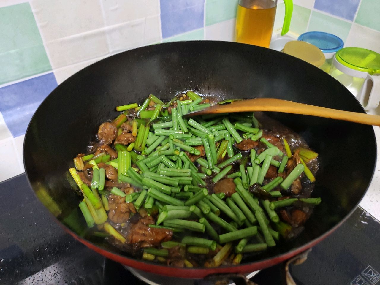再倒入蒜薹,加生抽,老抽,蚝油,盐,鸡精调味,加少量水