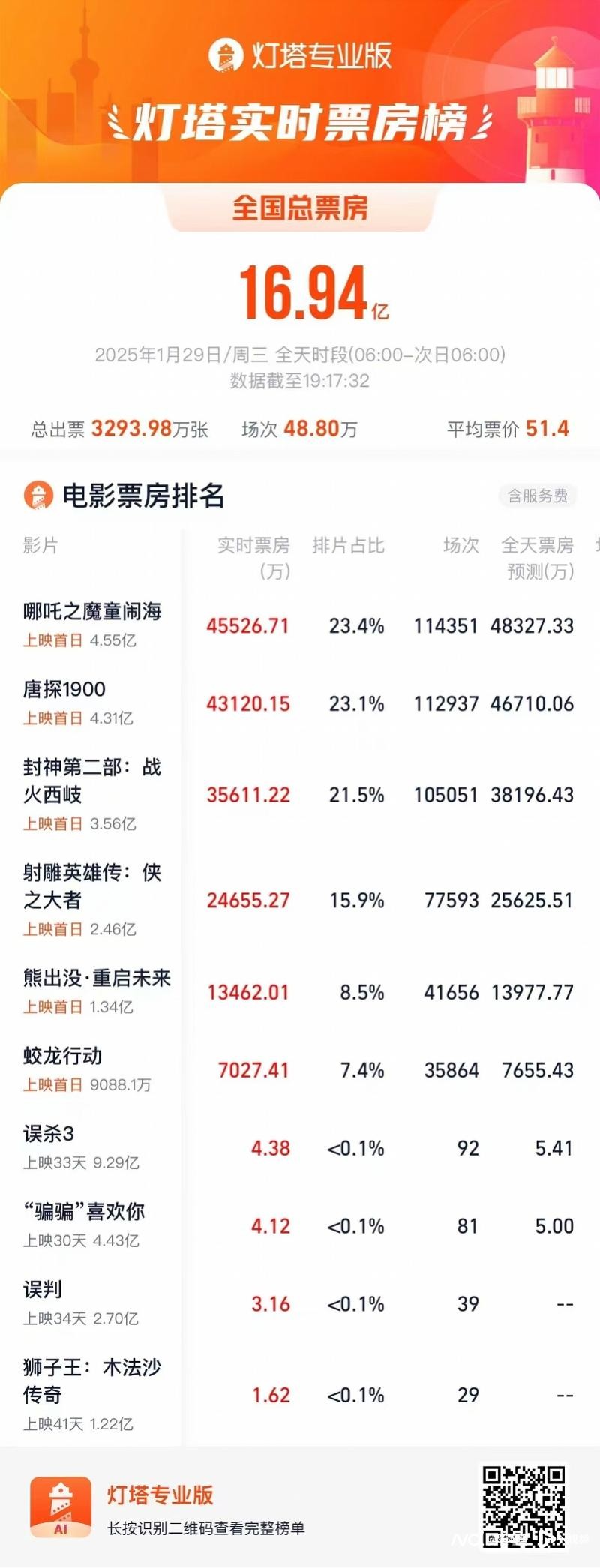 春节档首日票房突破16亿元!《哪吒之魔童闹海》领跑