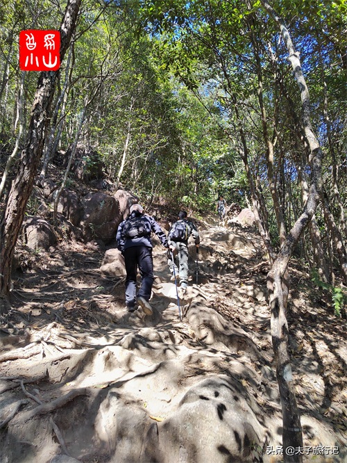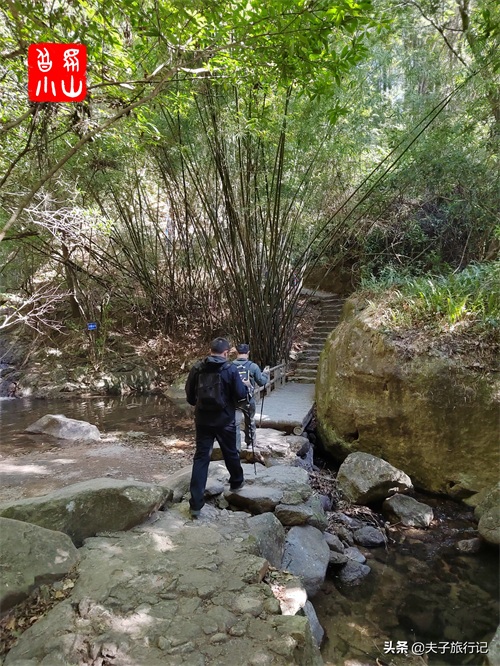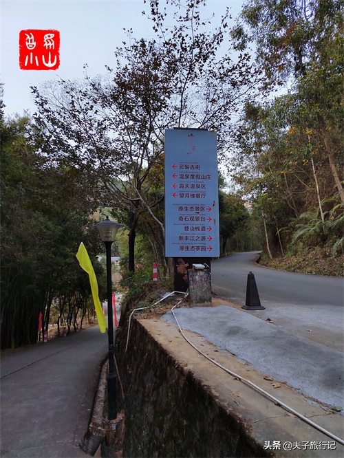 登顶后从另一侧小路下山,经天狗石继续下行,直行走大环线,全程16公里。我们左转,选择了小环线,全程约12公里,6小时。一路下行,最后经过望月楼温泉山庄、云髻古村回到门口岔路,然后去取车。也可以下山时遇到水渠左转直接到台阶路登山入口停车场取车。