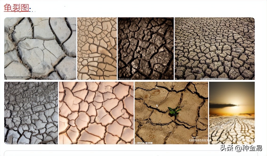 龟裂:(物体)裂开许多缝,出现许多裂纹。其实不仅田间地头的干旱,在许多树皮(如松树皮)、萝卜、西瓜等上也有这种情况。