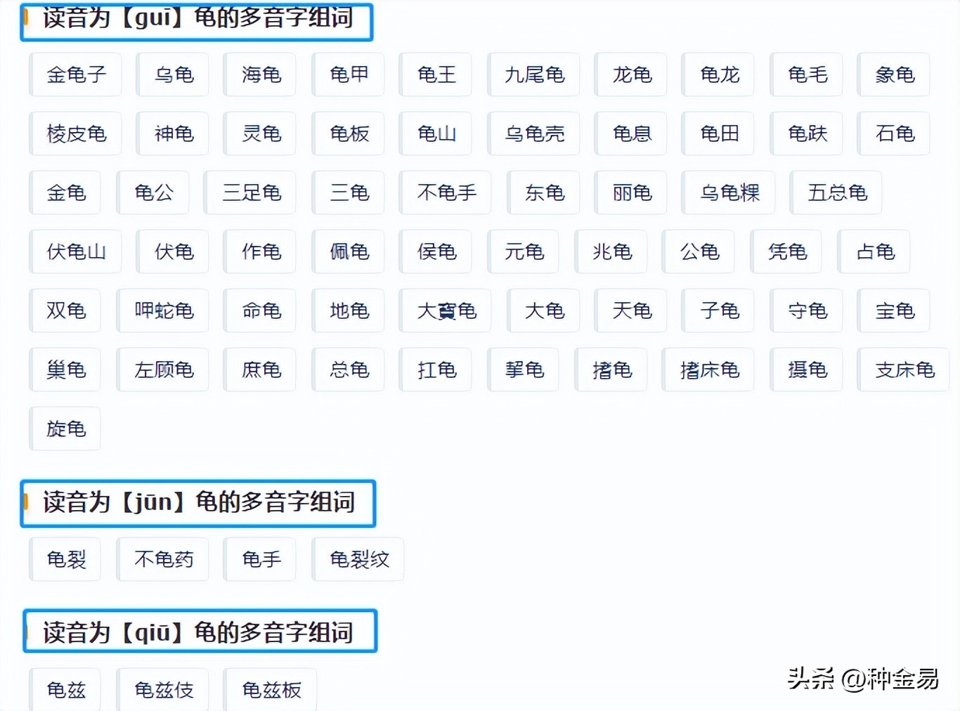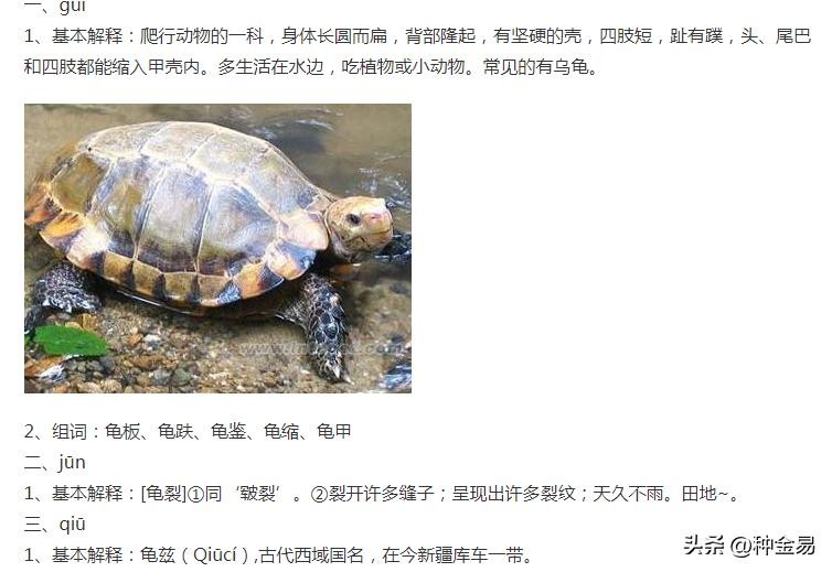 还真没注意到:龟字是个多音字,竟然共有 3个读音:guī、jūn、 qiū。