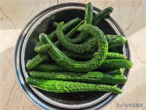 5.到时间后,把黄瓜捞出,沥净水分,放在盆内待用。腌好的黄瓜不要用水洗,水洗后,腌好的黄瓜不易保存。