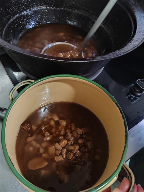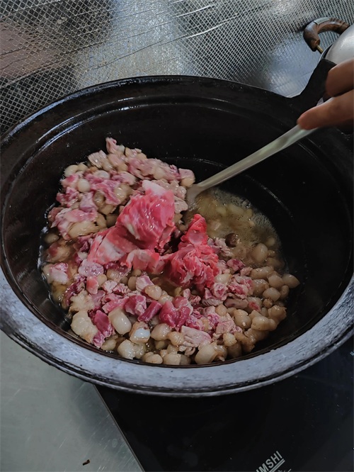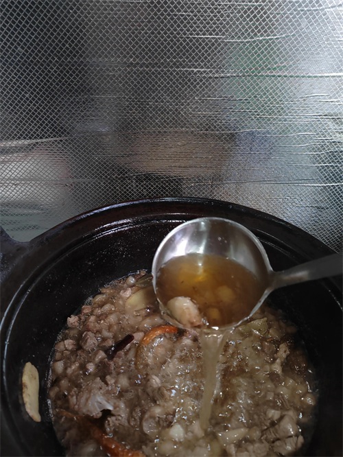 7.待把老抽和锅里肉翻炒至颜色均匀后后转小火,加适量开水后盖锅盖继续煮大概40分钟左右,熟了再加适量盐,少许鸡精,继续炖煮几分钟,待把加进去的水练完汤呈清亮色即可出锅。