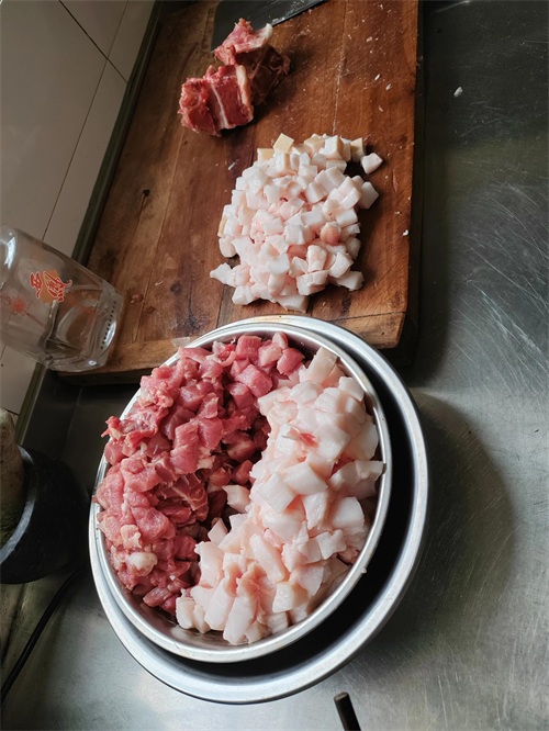 1.首先刮干净肉皮但不去皮,洗干净后沥干水分。将肥瘦肉分开,切成1-2厘米的小块,厚约1厘米,切好后肥瘦肉分开放。