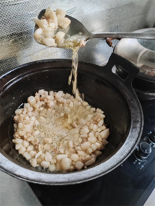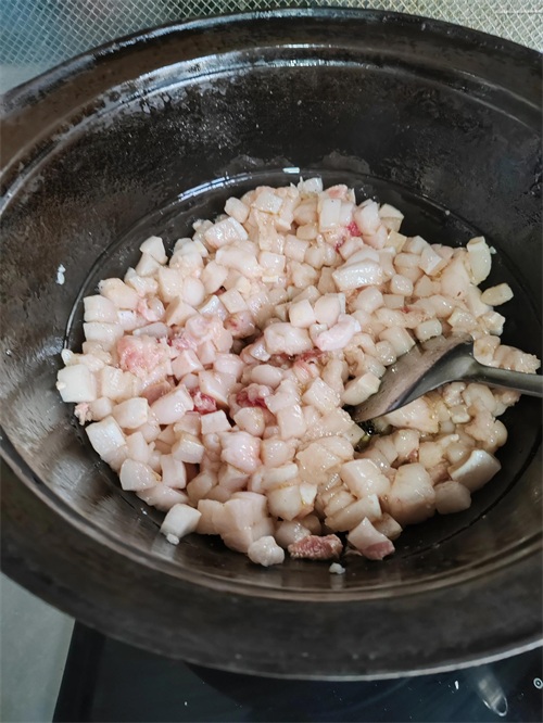 3.锅烧热,如肥肉较少倒入少量油,肥肉多则直接倒入肥肉块,用中小火慢慢炼,不停搅拌防止油溅出。