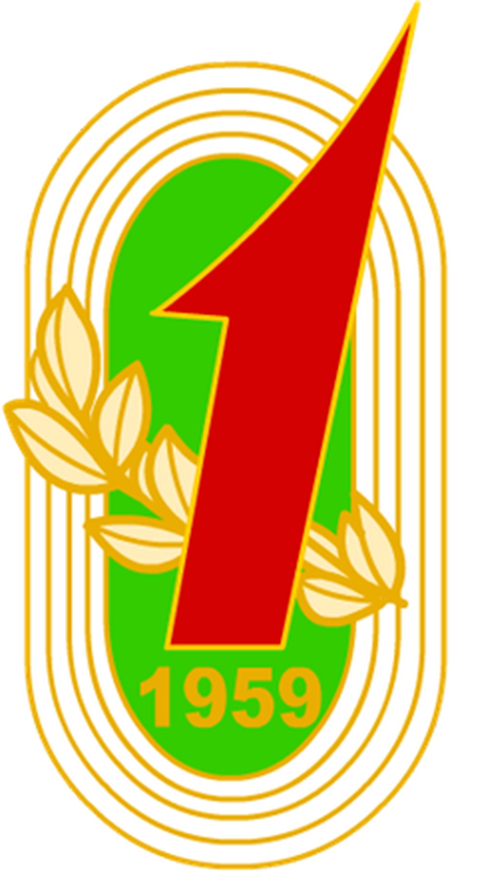 第一届全运会举办于1959年北京,会徽由金色的跑道、金色的麦穗和夸张的红1字组成,麦穗代表建国十年的丰硕成果,冲出跑道的1也代表新中国人民建设中国的激情。