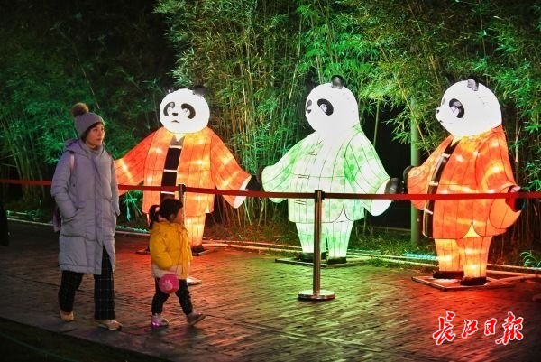 此次武汉园博园灯会中,动物成为了灯会主要元素,天上飞的、地上跑的、水里游的,甚至神话动物共有343个,其中国宝熊猫最具规模和特色。灯会的彩灯扎制方艺术总监龙勇说,此次灯会中布设了180米长的《熊猫乐园》花灯,以熊猫“开飞机”“涮火锅”“打麻将”“骑自行车”“拜年”等14个生动有趣的系列故事场景展现。 “园博园白天来过很多次,风车节、中华礼乐大会都来过,但灯会还是第一次来。”家住长丰街的周小贤说,4公里长的花灯路,像古代的上元灯会一样,年味都变浓了。