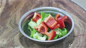 青椒一个切成滚刀块,红椒半个同样切成滚刀块,和青椒放在一起用来配色。