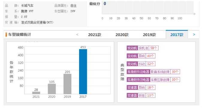 从VV7车主们的描述中我们可以看出,VV7自身的产品问题很多,根据车质网显示的车主投诉数据来看,2017款VV7的车型故障投诉量达到了453条,2019款的故障投诉达到了205条,2020款虽然销量惨淡,但是故障投诉也有105条,就连卖不出去的2021款新车,投诉数量也有28条。从实际的投诉内容上来看,大多发生在变速箱、发动机、车身附件、电器系统等方面,例如变速箱异响、发动机抖动、换挡顿挫严重、刹车异响、仪表台开裂等问题。这确实对不起豪华车的身份和定位,虽然WEY在2020年的新车上面做出了积极的改正,问题已经少了不少,但是在发动机和变速箱上面又出现了新的问题。