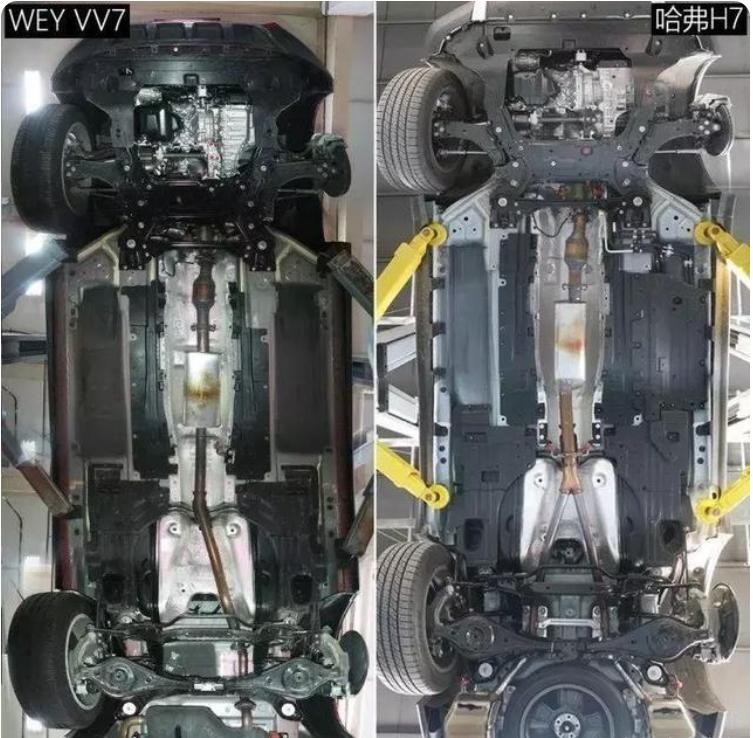 另外,就是车辆的操控性差,被车主戏称为换壳版哈弗。长城WEY的“三大件”(发动机、变速箱、底盘)实力确实非常一般,从下面这张图中可以看出,VV7与哈弗H7的底盘结构几乎一模一样,而且在动力系统上面,也是搭载的长城自研的发动机和变速箱。
