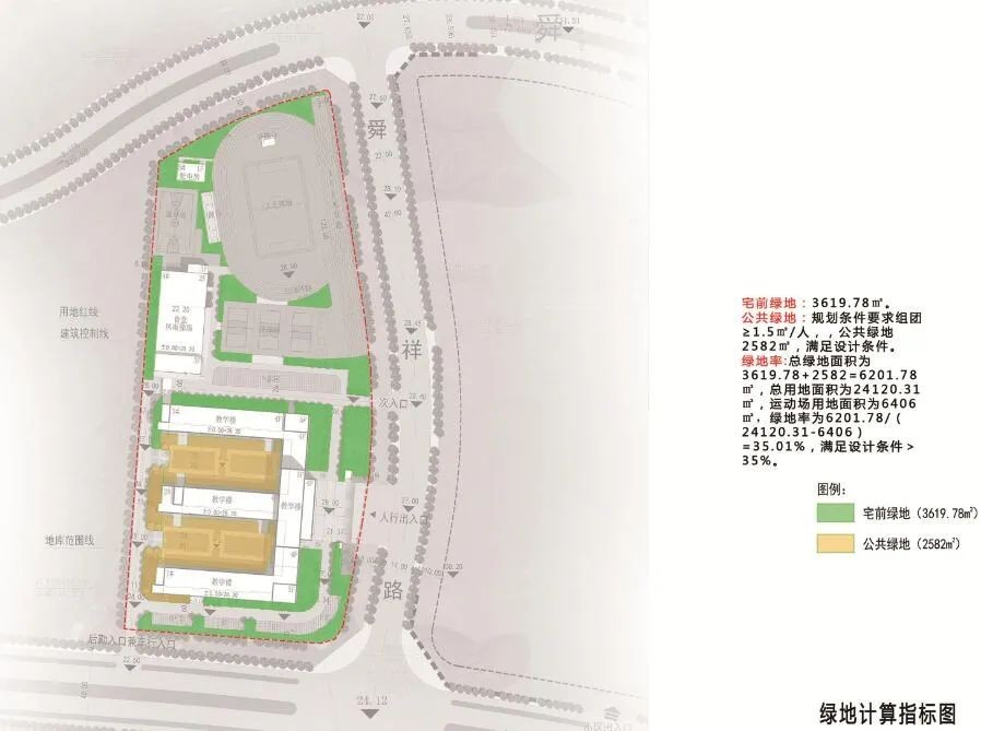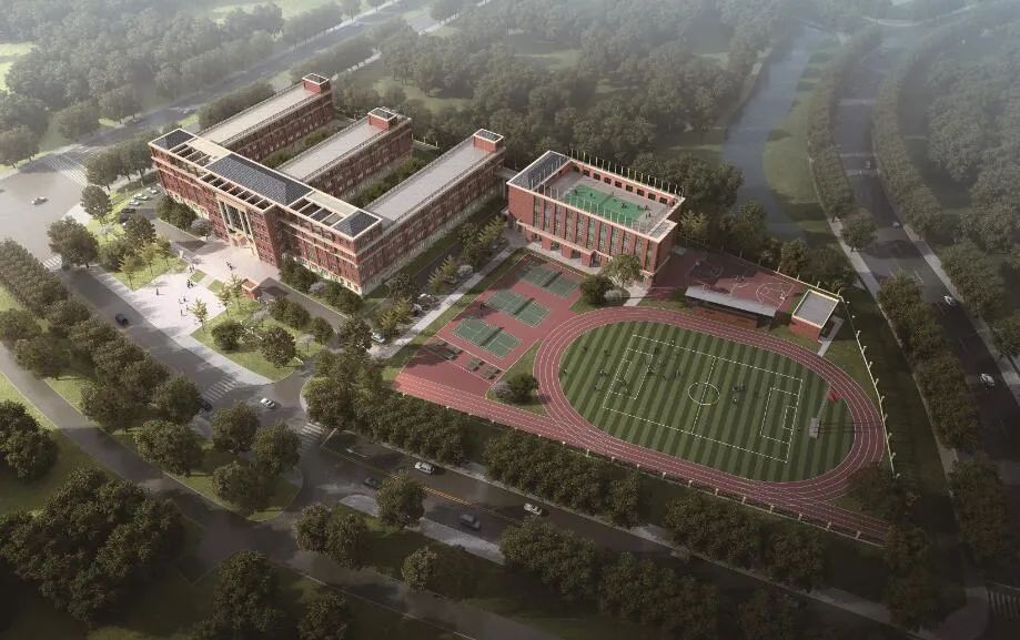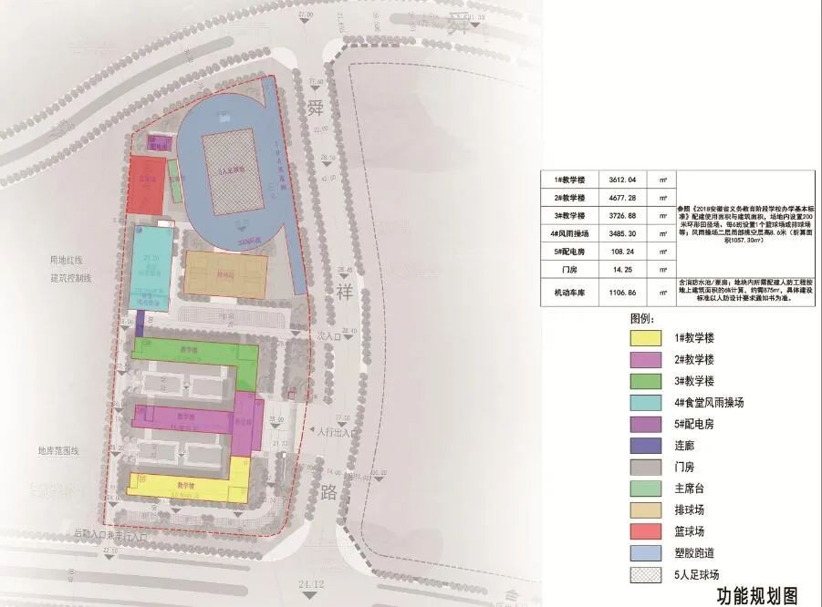 地块的西边为交通流量较大城市次干道,并且临近居住区出入口,人流量及车流量较大,噪音污染较为严重。此次规划将教学楼集中设置在地块西侧位置,紧邻教学楼南侧为两栋综合楼,北侧规划一栋食堂及风雨操场;地块北侧规划一处看台、250米环形跑道运动场及篮球场、排球场和体育器材区。规划通过北侧的运动区、食堂及风雨操场和南侧的综合楼,将教学区与噪音源隔绝开来,充分保证教学区域安静的教学环境。