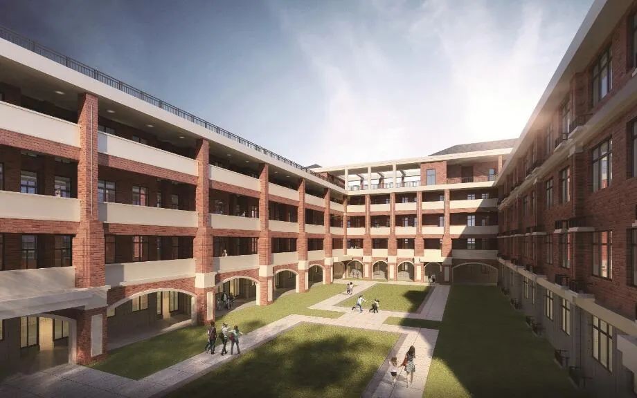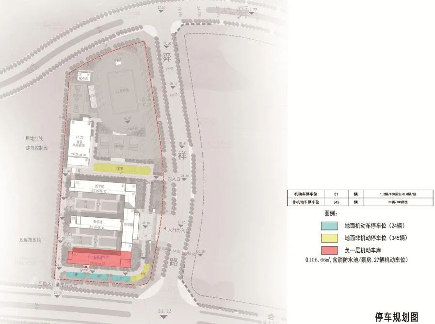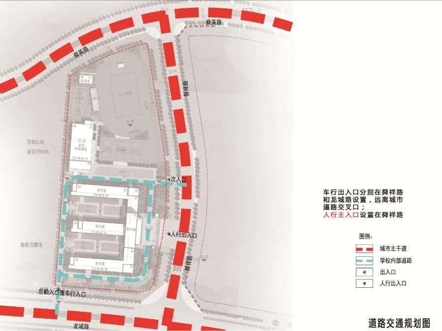 教学区共设置三处出入口。学生出入口设置在东侧的舜祥路上。通过将入口大门处的缓冲地带来缓解道路上的交通压力。并且在大门附近设置一处家长等候区,供家长接送子女时等候使用,避免了出入口出的人流堆积的情况,并且缓解了道路交通压力。另外一处出入口设置在南侧的龙城路,为消防及后勤出入口。学生非机动车位设置在龙城路一侧,而机动车出入口设置在舜祥路上。至此,校园内实现了完全的人车分流模式。