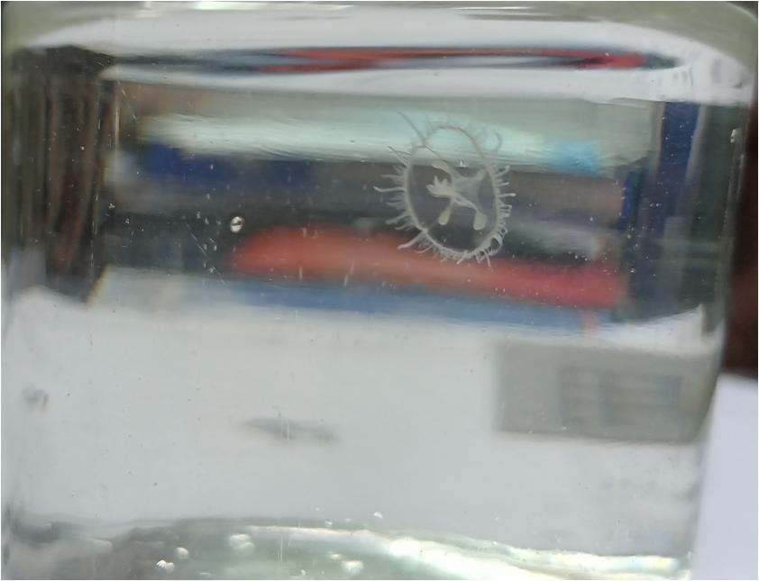 8月10日,长汀环境监测站工作人员对长汀县县级集中式饮用水水源地正方水库开展日常水质监测。在其中的一次深水采样器采样中陡然发现一个透明、无色生物在采样瓶中游弋。监测人员旋即咨询省市专家,经专家鉴定该生物为桃花水母,通称"桃花鱼","降落伞鱼",因多栖于淡水,故又名淡水水母。