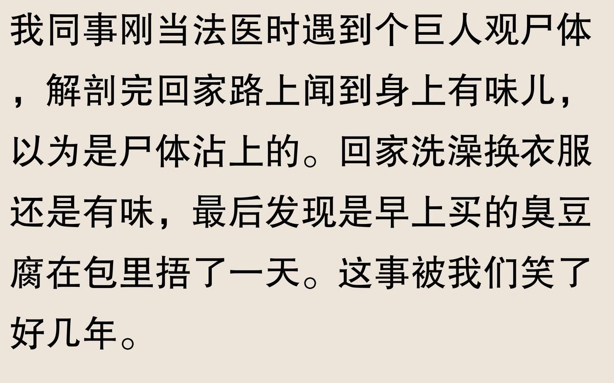 我同事刚当法医时遇到个巨人观尸体,解剖完回家路上闻到身上有味儿,以为是尸体沾上的。回家洗澡换衣服还是有味,最后发现是早上买的臭豆腐在包里捂了一天。这事被我们笑了好几年。